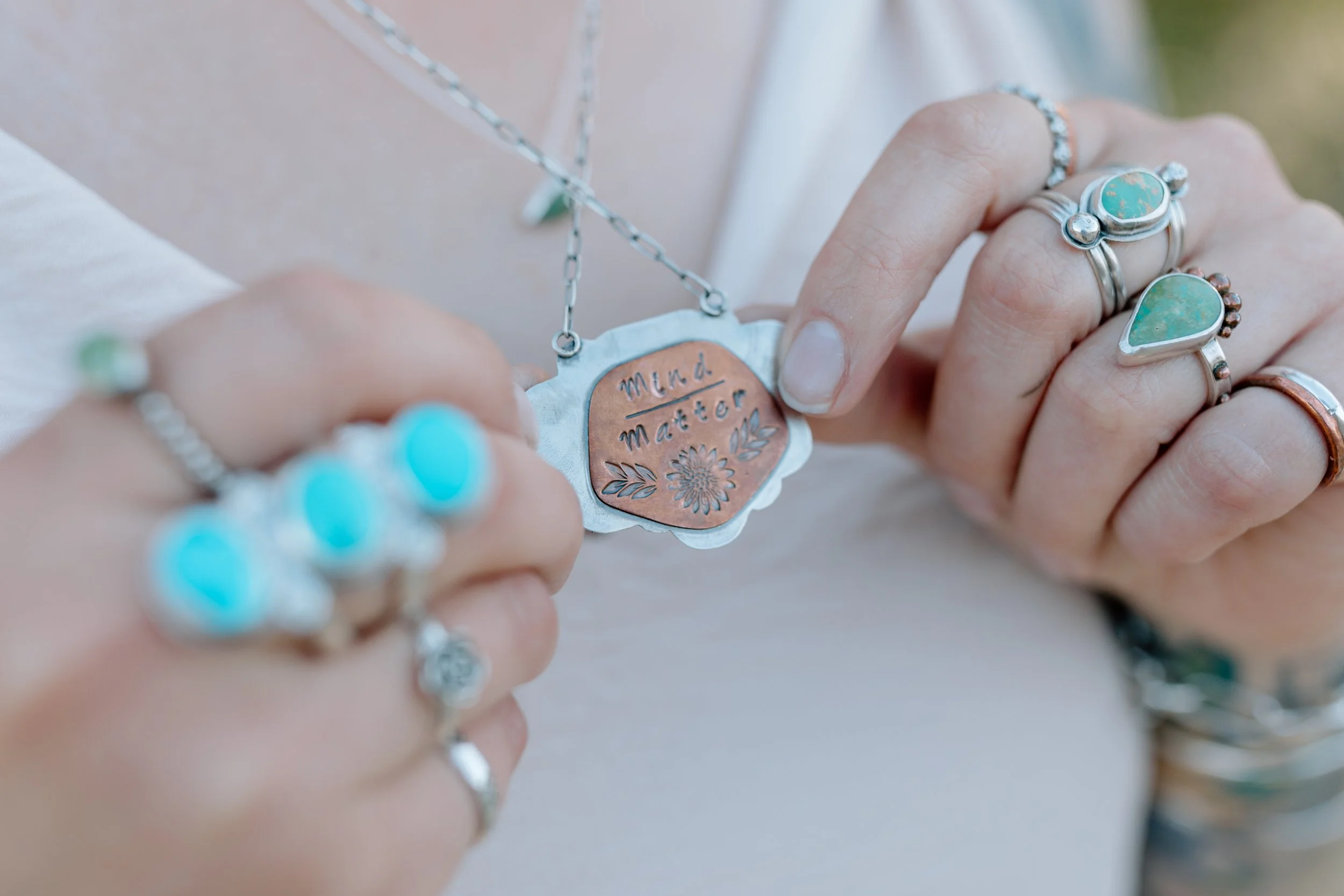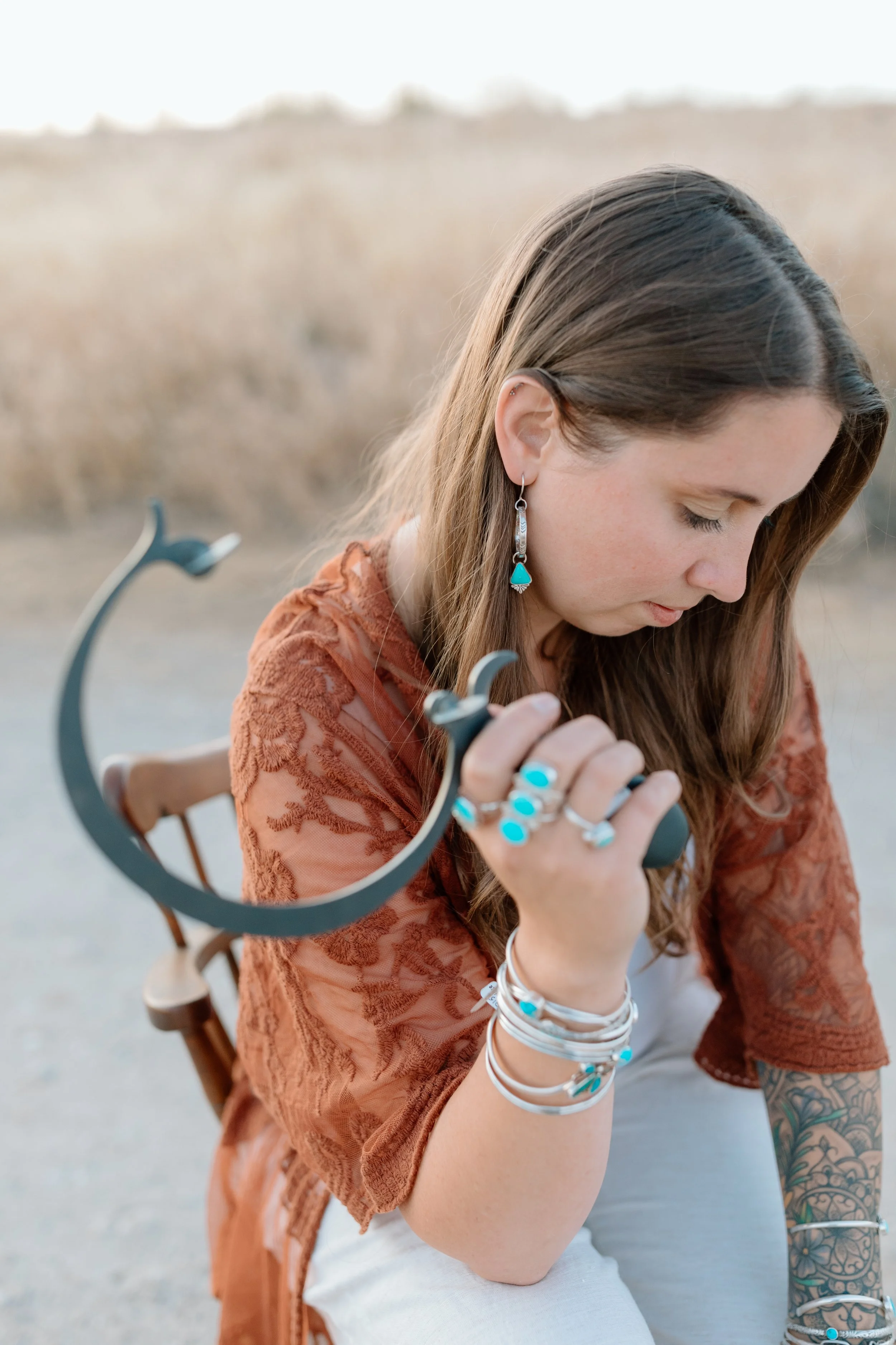 Fire and Fringe began as a creative escape in 2020 and has grown into a full-time passion for designing handmade sterling silver jewelry. I work mostly with Turquoise but love working with a variety of stones including moonstone, agates, and jasper. I am mostly drawn to the blues, greens and neutral tones in the stones!